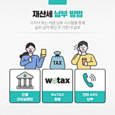 위택스(Wetax)나 인터넷 지로를 통해 온라인으로 납부하거나, 은행 창구나 은행 CD·ATM기기를 이용하여 현금 또는 신용카드, 체크카드로 납부할 수 있습니다.