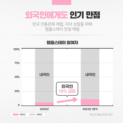 한국불교문화사업단에 따르면, 2023년 1분기 기준으로 전체 템플스테이 참가자 중 약 10%가 외국인이라고 합니다. K-Pop 문화의 인기와 함께 템플스테이가 미디어에 자연스럽게 노출되면서, 한국 전통문화 체험과 자아 성찰을 이유로 많은 외국인 관광객들이 템플스테이를 찾고 있습니다.