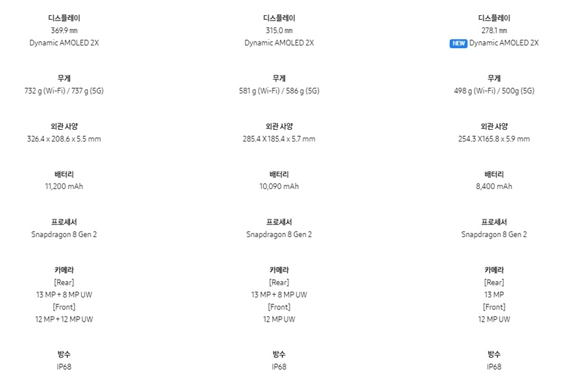 갤럭시 탭 전 모델 그라파이트와 베이지 색상으로 출고되고, 3개 모델 모두 와이파이 지원 모델과 5G 지원 모델로 각각 지원되며, S펜이 기존 제공됩니다