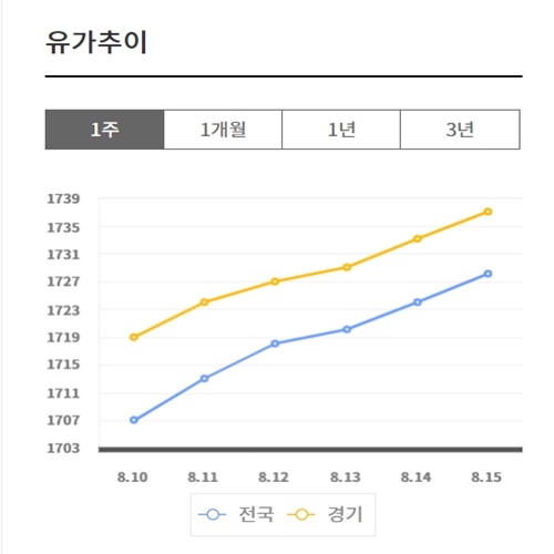 8월 현재 평균 유가는 아래와 같으며 유가상승 원인은 다음과 같습니다.