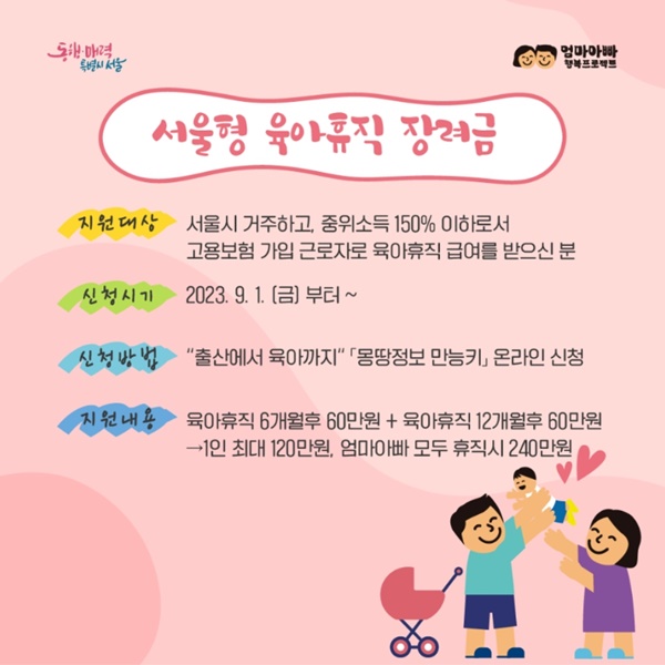서울시에서는 아이 키우기 좋은 도시, 서울을 만들기 위한 엄마아빠 행복프로젝트가 시행 중입니다. 그 일환으로 임산, 출산, 육아 관련 정책들이 속속 생겨나고 있습니다. 서울시에 거주하고 있는 부부 및 가정에게는 희소식이 아닐 수 없습니다. 관련 정책을 잠깐 살펴보면 엄마아빠택시, 난임부부 시술비 지원, 임산부 교통비 지원이 있고, 오늘 소개해드릴 정책은 서울형 육아휴직장려금입니다. 아주 유용한 정보이니 끝까지 읽어봐 주시길 바랍니다.