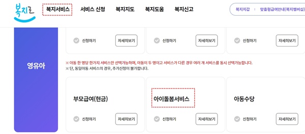 < 복지로 홈페이지- 로그인 - 서비스 신청 - 복지서비스 신청 - 복지급여신청 - 영유아 - 아이돌봄서비스>