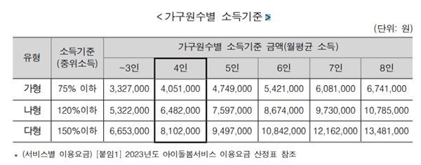 아이돌봄서비스는 소득기준에 따른 가구 유형별로 차등하여 정부지원율을 적용합니다.