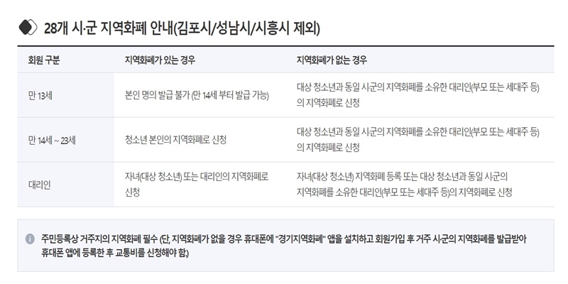 경기도 청소년 교통비 지원사업은 경기도에 거주하는 만 13세에서 23세까지의 청소년을 대상으로 하고 있습니다.