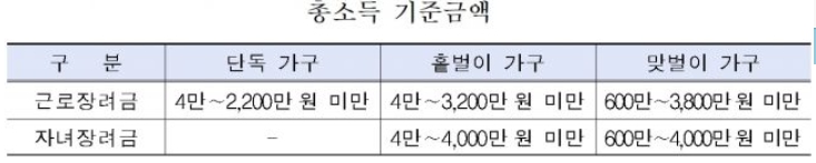 소득기준을 보면 2022년 부부합산 총소득(근로·사업·종교인소득 및 이자·배당·연금·기타소득 포함)이 가구 구분에 따른 기준금액에 속해야 한다. 근로장려금은 단독 가구가 4만~2200만원 미만, 홑벌이 가구가 4만~3200만원 미만, 맞벌이 가구가 600만~3800만원 미만이다. 자녀장려금의 경우엔 홑벌이 가구가 4만~4000만원 미만, 맞벌이 가구가 600만~4000만원 미만이다. 이를 지급받으려면 18세 미만(중증장애인은 연령제한 없음)의 부양자녀가 있어야 한다. 또 2022년 6월 1일 기준으로 가구원 모두가 소유하고 있는 부동산, 자동차, 예금 등 재산합계액이 2억4000만원(종전 2억원) 미만이어야 한다. 부채는 재산에서 차감하지 않는다. 국세청은 "금융재산을 제외하고 나머지 재산이 2억4000만원 미만인 가구에 안내하고 있으며, 8월에 지급요건 심사 시 금융재산을 포함해서 가구원 전체의 재산이 2억4000만원 이상이면 장려금을 지급하지 않는다"고 했다. 근로장려금의 최대지급금액은 맞벌이 가구 기준으로 330만원(종전 300만원)이다. 최대지급액 기준으로 단독 가구가 165만원(150만원), 홑벌이 가구가 285만원(260만원)이다. 자녀장려금은 만 18세 미만 부양자녀 1명당 80만원(최대지급액)을 받을 수 있다. 신청할 때 유의해야 할 사항은 신청금액과 실제 지급되는 금액이 다를 때도 있다.