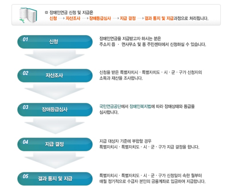장애인연금 신청 및 지급은 아래의 절차로 처리됩니다.