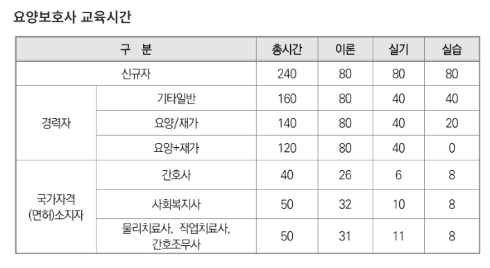 국가 자격증 소지자 중 사회복지사, 간호조무사, 물리치료사는 50시간이며, 간호사는 40시간 교육 과정을 이수 후 요양보호사 자격시험에 응시할 수 있습니다.