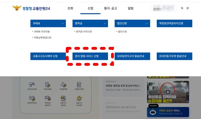 아래 문자 알림 서비스를 신청해 둔다면 과태료 고지서 발송 시 문자로 알림을 받을 수 있습니다.
