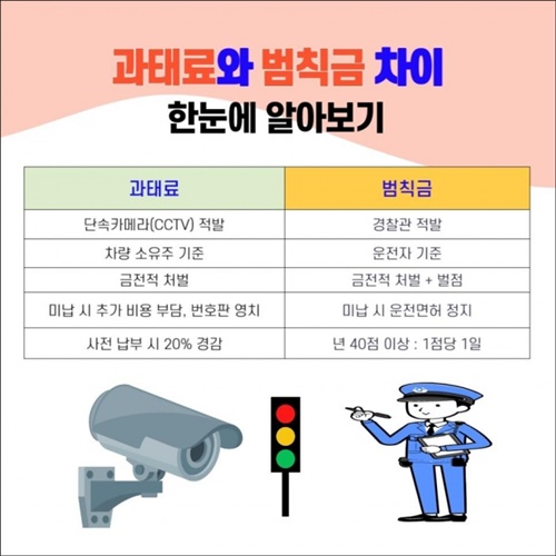과태료와 범칙금은 부과 금액 및 벌점에도 차이가 있습니다.