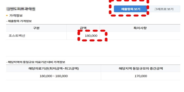세부 정보를 클릭하면 가격정보가 나오고, 다른 병원과 가격비교까지 할 수 있어서 편리합니다.