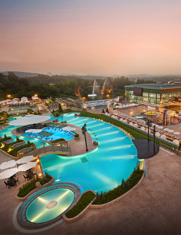 특히, 사계절 이용할 수 있는 ‘워터파크&온천스파’는 실내 약 5,830평, 실외 약 1,200평 규모로 다양한 물놀이 공간을 보유하고 있습니다.