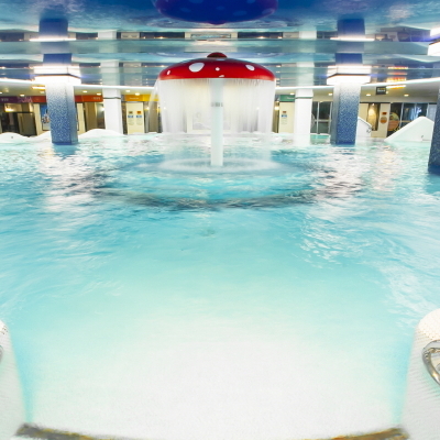 특히 10여 종의 수치료와 마사지 시설이 있는 수심 1.2m에 직경 30m 되는 세계적인 규모의 바데풀로 온천과 수영을 동시에 즐길 수 있는 것이 인기 비결이며. 실내 바데풀에는 유수풀, 유아풀, 테마 이벤트탕, 사우나 등이 마련돼 있습니다.