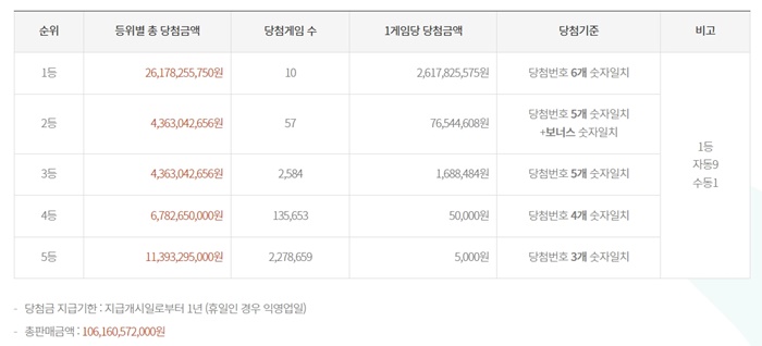 당첨 번호 6개 숫자가 일치해야 하는 1등은 총 10명이 당첨되었고, 1인당 2,617,825,575원씩 수령 가능합니다.