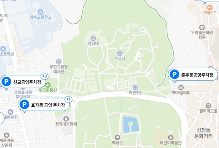 ● 춘추문 공영주차장 : 도보로 9분 거리, 청와대까지 거리 515m