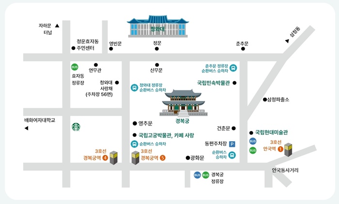 ● 3호선 안국역 1번 출구로 나와 청와대까지 도보 20분 이동