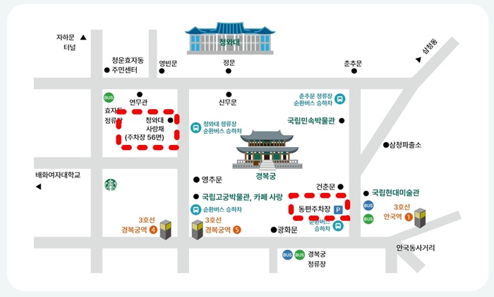 ● ‘국립고궁박물관 정류장’에서 01A번 버스 승차 후 ‘청와대 정류장’ 또는 ‘춘추문 정류장’에서 하차