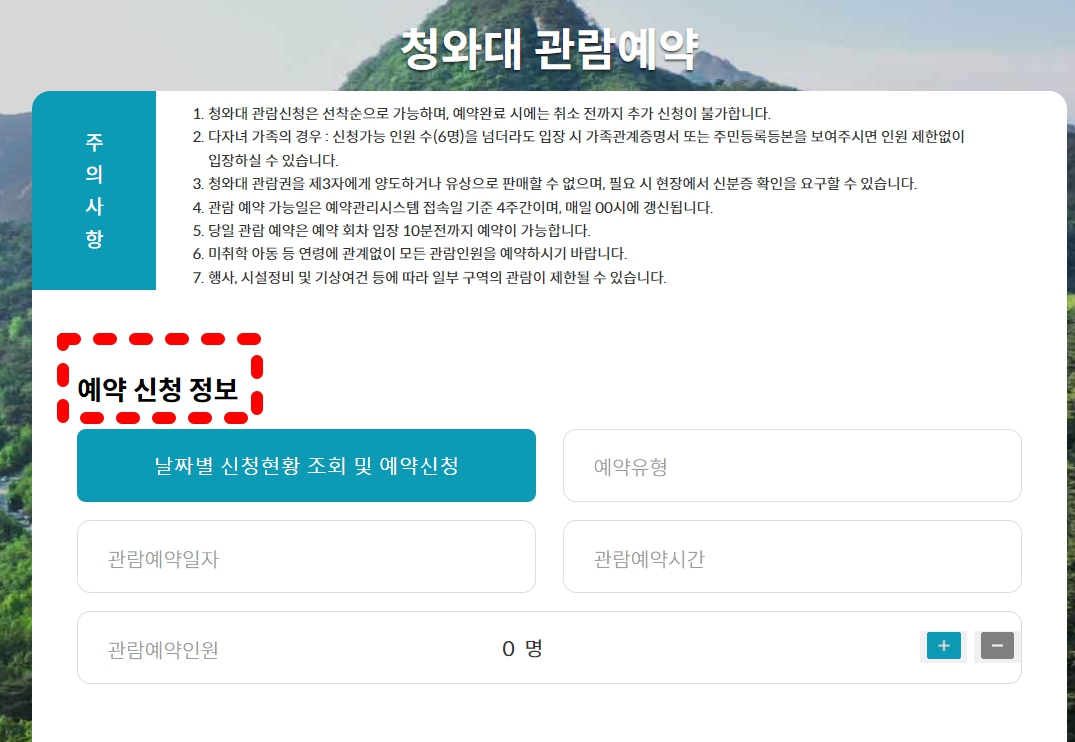 청와대가 개방됨에 따라 관람을 원하시는 분들이 많아졌습니다. 청와대를 관람하기 위해서는 사전 예약 신청이 필요합니다. 신청 방법과 주차장 안내, 소요시간 등 자세한 내용에 대해 확인하신 다음 청와대 관람 예약 시스템에 접속하셔서 신청하시기 바랍니다.