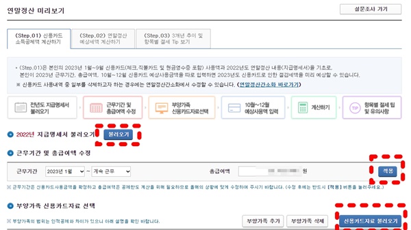 ✅ [STEP.01] 신용카드 소득공제 계산하기]를 클릭합니다.