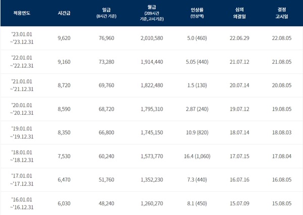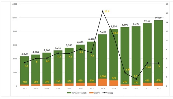 2023년 최저임금은 전년 대비 5% 인상된 9,620원, 2024년 최저임금은 전년 대비 2.5% 인상된 9,860원으로 결정되었습니다.