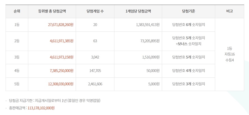 당첨 번호 6개 숫자가 일치해야 하는 1등은 총 20명이 당첨되었고, 1인당 1,383,591,413원씩 수령 가능합니다.