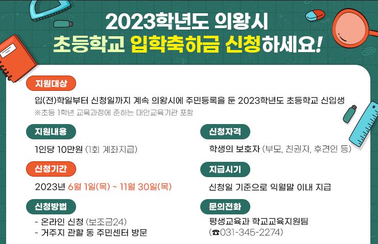 ★지원대상 : 의왕시에 주소(입학일 또는 전학일로부터 신청일까지 계속)를 둔 2023학년도 초등학교 입학생