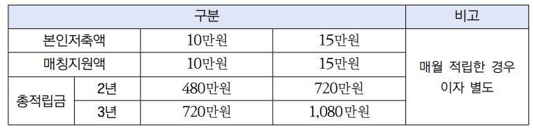 월 저축가능 금액 및 지원내용