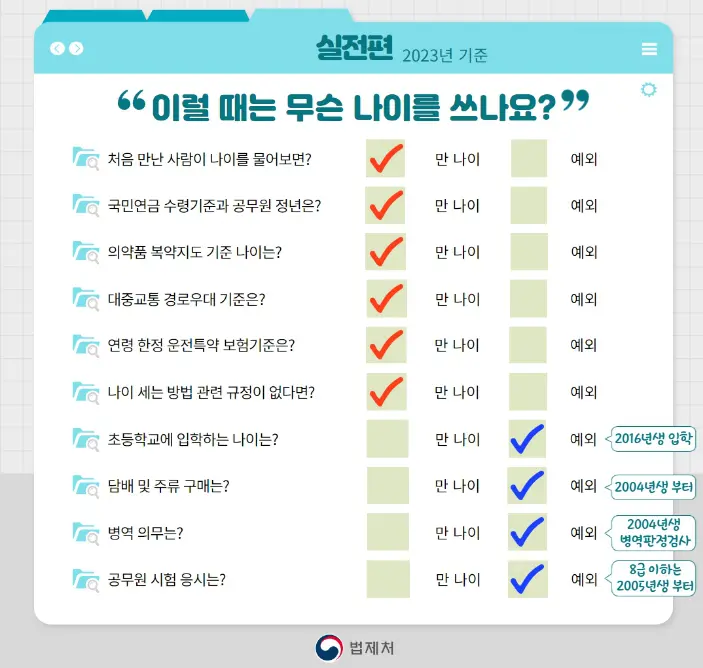 그동안 우리나라에서는 '세는 나이', '연 나이', '만 나이' 세 가지 나이 계산법을 혼용해 왔지만, 2023년 6월 28일부터는 만 나이 통일법으로 1살 또는 2살이 어려집니다. 아직은 혼란스러운 부분이 있지만, 만 나이 계산방법을 쉽게 알려드리고, 또 만 나이 통일법으로 적용되는 부분, 예외대상에 대해서 알아보겠습니다.