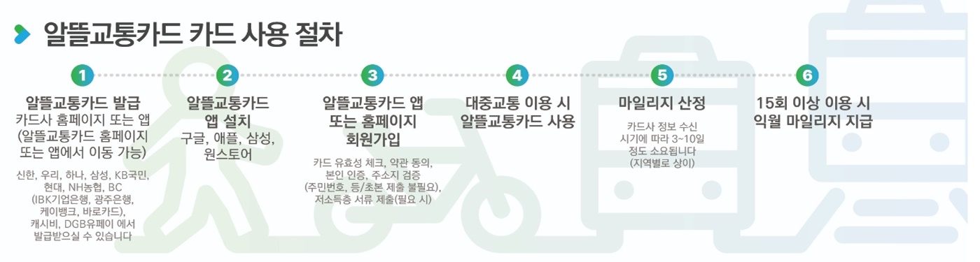 국민들의 대중교통비 절감 및 대중교통 이용 활성화를 위해 대중교통 이용 시 이동거리(보행, 자전거 등 )만큼 마일리지를 지급해 주는 사업으로 대중교통을 이용하기 위해 걷거나 자전거로 이동한 거리만큼 마일리지를 적립해 지급하고 카드사의 추가 할인혜택을 포함해 대중교통비를 30% 이상 절감할 수 있는 교통카드입니다. 정부와 지자체가 50:50으로 부담하여 시행되는 제도로 정부 주도로만 할 수 없기에 아직 시행하지 않는 지자체도 있습니다. 예전에는 광역알뜰교통카드였으나, 21년도 4월부터 알뜰교통카드로 명칭이 변경되었습니다.
