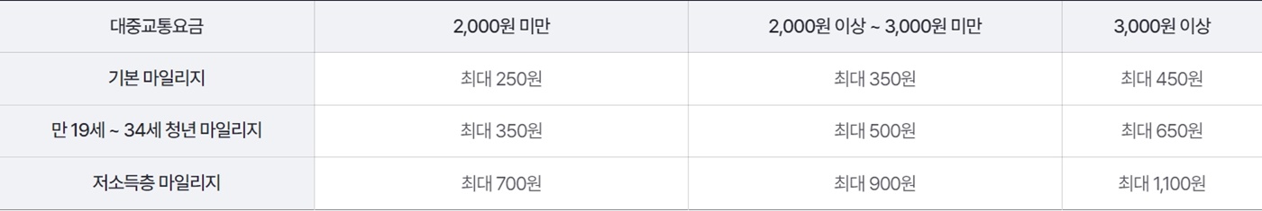 대중교통이용금액으로 최대 지급액이 결정되며, 적립액은 이동거리에 비례하여 적립됩니다.