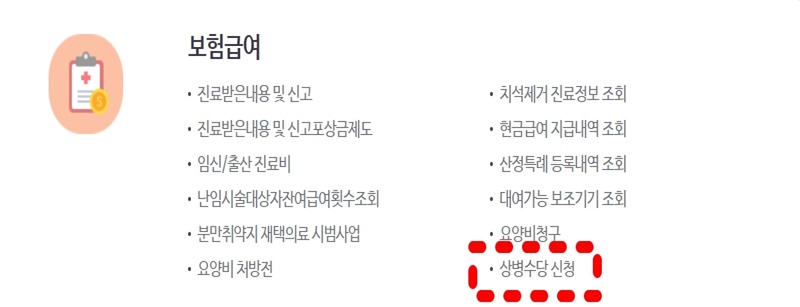 건강보험공단 홈페이지(https://www.nhis.or.k)에 로그인 후 개인민원 -> 상병수당 클릭 🔍